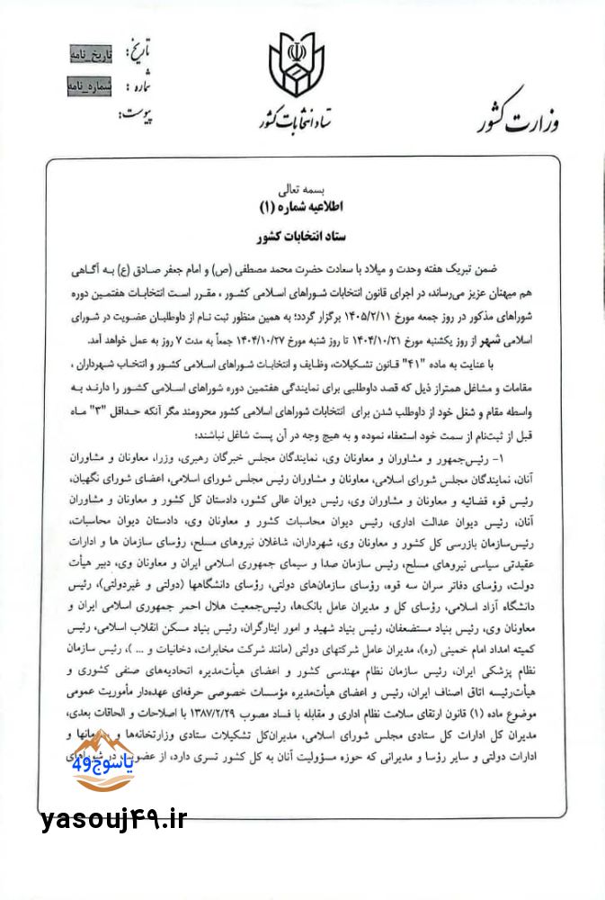 فرماندار دنا اظهار داشت: داوطلبان واجد شرایط میتوانند با همراه داشتن مدارک شناسایی و مستندات لازم، از روز یکشنبه مورخ ۱۴۰۴/۱۰/۲۱ تا روز شنبه مورخ ۱۴۰۴/۱۰/۲۷ جمعاً به مدت ۷ روز نسبت به ثبتنام اقدام نمایند با عنایت به ماده ۴۱ قانون تشکیلات وظایف و انتخابات شوراهای اسلامی کشور و انتخاب شهرداران ، مقامات و مشاغل همتراز ذیل که قصد داوطلبی برای نمایندگی هفتمین دوره شوراهای اسلامی کشور را دارند به واسطه مقام و شغل خود از داوطلب شدن برای انتخابات شوراهای اسلامی کشور محرومند مگر آنکه حداقل ۳ ماه قبل از ثبت نام از تاریخ ۲۱ مهر الی ۲۷ مهر ۱۴۰۴ از سمت خود استعفا داده و به هیچ وجه در آن سمت شاغل نباشند.