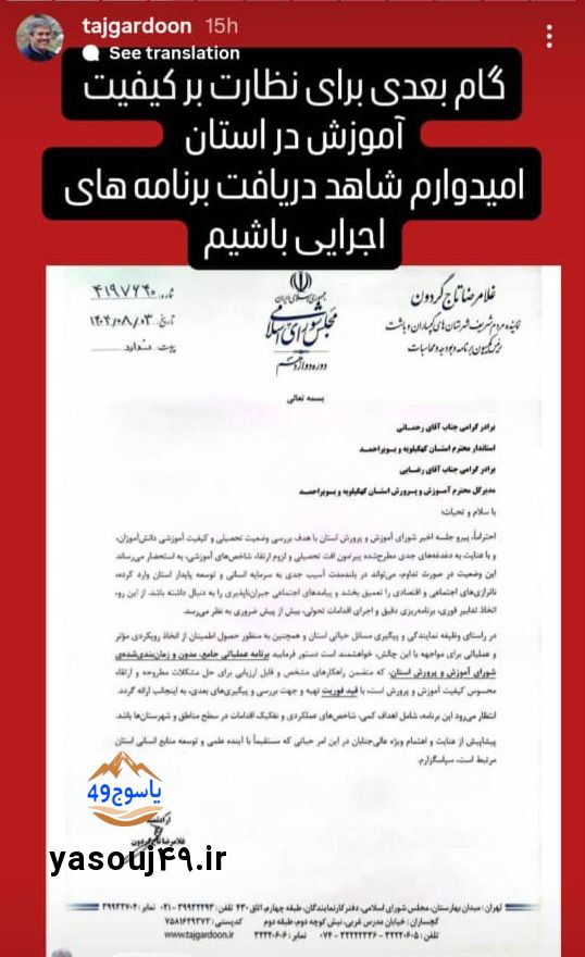 به گزارش یاسوج ۴۹ غلامرضا تاجگردون نماینده گچساران و باشت در مجلس پیرو دلسوزی و مطالبهگری خود برای فرزندان استان و دانش آموزان نامهای خطاب به استاندار و ایوب رضایی مدیر کل آموزش و پرورش نوشته و به صورت اورژانسی و اضطراری از آنها خواسته برنامه جامع و عملیاتی مدونی برای رفع مشکل افت آموزشی و معدل دانش آموزان در استان طراحی کنند که قاعدتاً اقدامی خوب و در چارچوب وظایف نظارتی نماینده به شمار میرود.