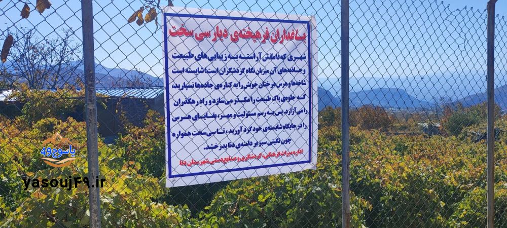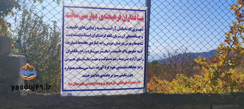 به گزارش یاسوج۴۹،مدیر تازه نفس میراث فرهنگی گردشگری و صنایع دستی دنا در اقدامی خوب، با نصب در چندین نقطه جاده باغات سیسخت منتهی به مناطق گردشگری، از مردم شهر سیسخت درخواست کرد که شاخ وبرگ اضافی درختان خود را در کنار جاده اصلی گردشگری رها سازی نکنند.