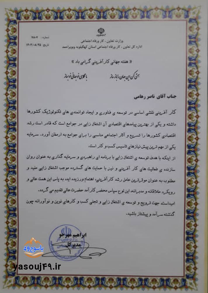 به گزارش یاسوج۴۹،در آئینی تحت عنوان همایش وفاق ملی و سرمایه گذاری برای تولید که در یاسوج با حضور نمایندگان مردم در مجلس شورای اسلامی و تنی چند از مسئولان استانی و شهرستانی برگزار شد از تولیدکنندگان و کارآفرینان نمونه استانی با لوح تقدیری از آنان تجلیل بعمل آمد.