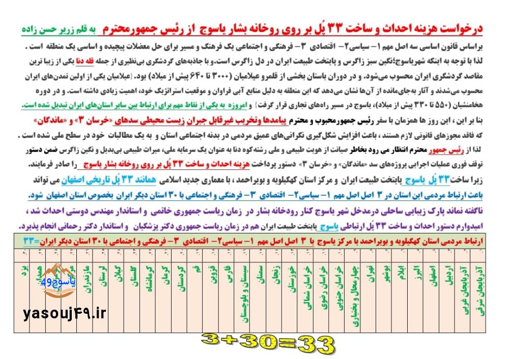 همزمان با اوجگیری نگرانیهای مردمی درباره تبعات سنگین سدهای خرسان سه و ماندگان، زریر حسنزاده در نامهای رسمی از رئیسجمهور محترم خواست تا با توقف این پروژههای مخرب و صدور دستور تأمین هزینه احداث ۳۳ پل ارتباطی بر روی رودخانه بشار، مسیر پیوند سیاسی، اقتصادی و فزهنگی اجتماعی یاسوج با ۳۰ استان کشور را احیا کند.