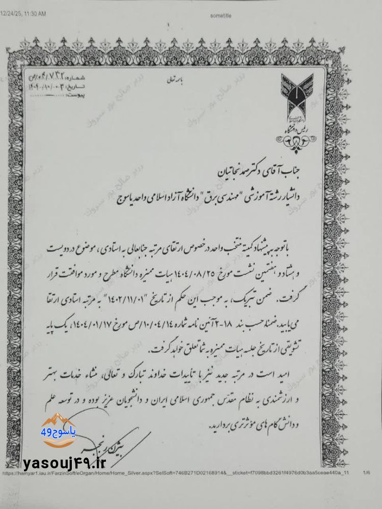 به گزارش یاسوج ۴۹، مسیر توسعه علمی و پژوهشی در استان کهگیلویه و بویراحمد همواره با تلاش نخبگان و اساتید دلسوز هموار میشود و این بار، خبری مسرتبخش از دانشگاه آزاد اسلامی استان کهگیلویه و بویراحمد، نویدبخش ارتقای سطح کیفی آموزش عالی در منطقه است. بر اساس حکمی رسمی که به امضای دکتر بیژن رنجبر، رئیس دانشگاه آزاد اسلامی رسیده است، دکتر «صمد نجاتیان» عضو هیئت علمی تماموقت گروه مهندسی برق این واحد دانشگاهی، به مرتبه علمی «استادی» (Full Professor) ارتقا یافت.