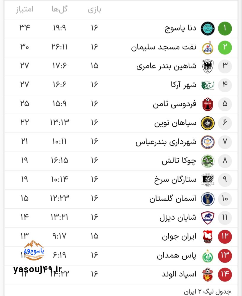 تیم فوتبال دنا یاسوج با مدیریت محمد بهرامی و هدایت قاسم سیامکی بازیکن اسبق استقلال تهران این هفته و در یکی از دیدارهای حساس و مهم توانست تیم فوتبال شهرداری بندرعباس را با دو گل شکست داده و با ۳۴ امتیاز همچنان در صدر جدول رقابتهای گروه دوم لیگ دسته دوم فوتبال کشور باشد.